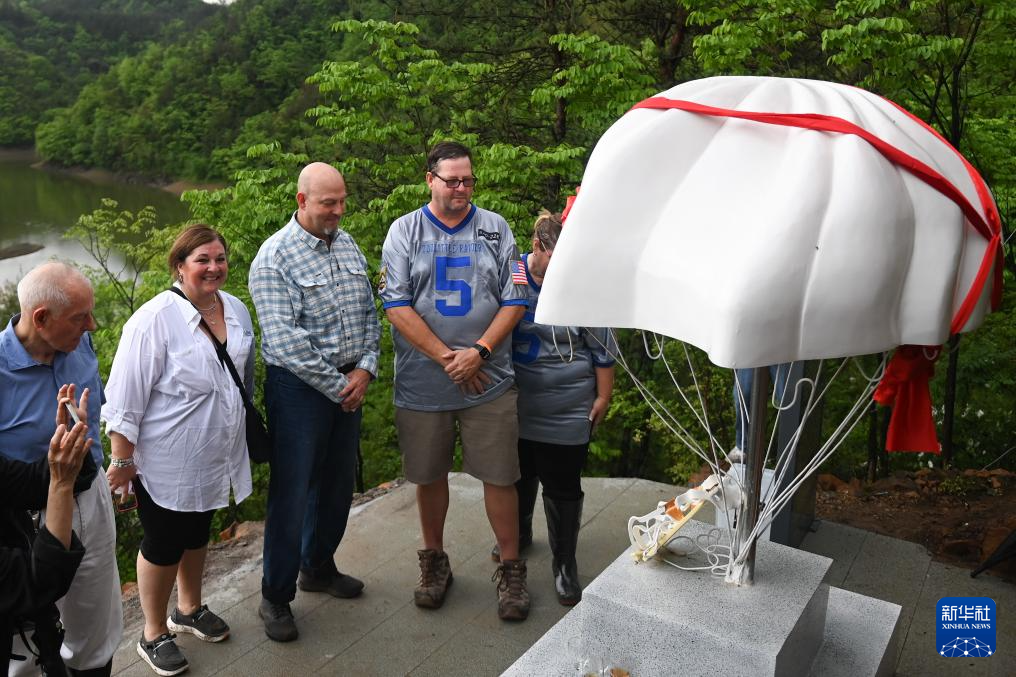 在衢州江山市大桥镇芳源村,获救美国军人后代与村民代表一同出席“杜立特行动”威尔德降落点标识落成仪式(4月16日摄)。1942年,“杜立特行动”5号机飞行员罗斯·威尔德曾在村民毛光孝等的救援下安全转移。