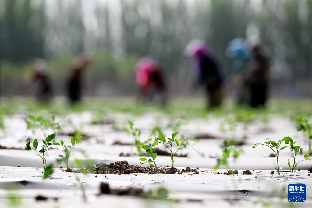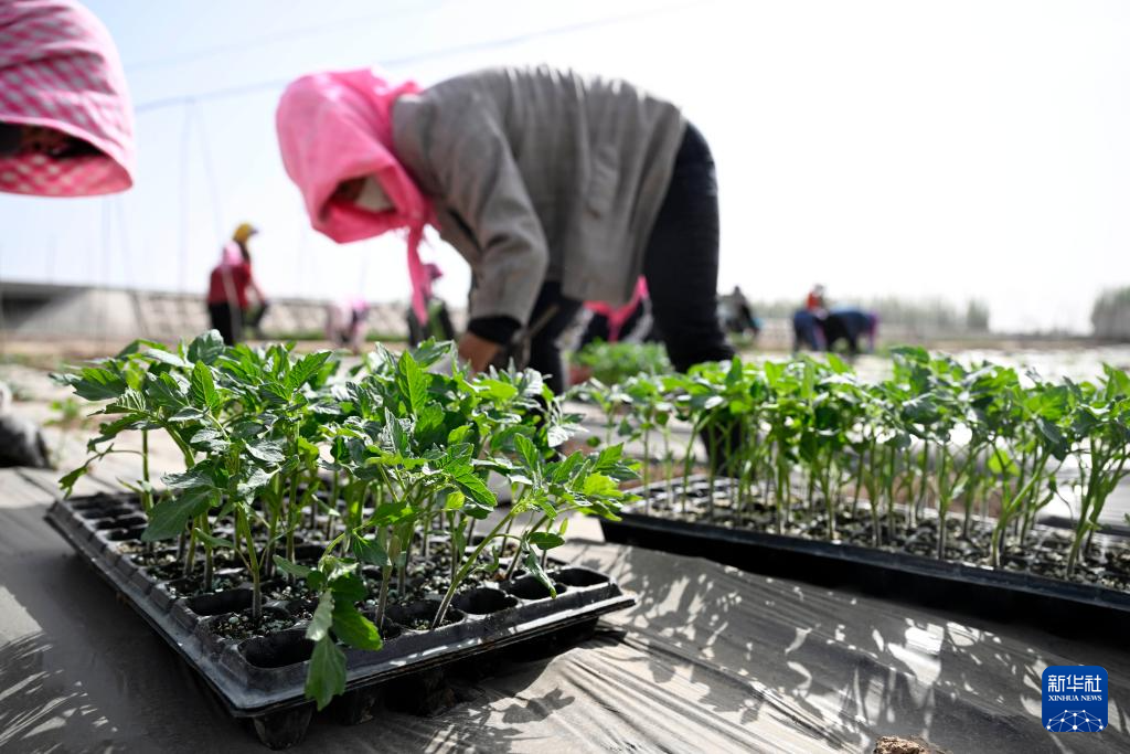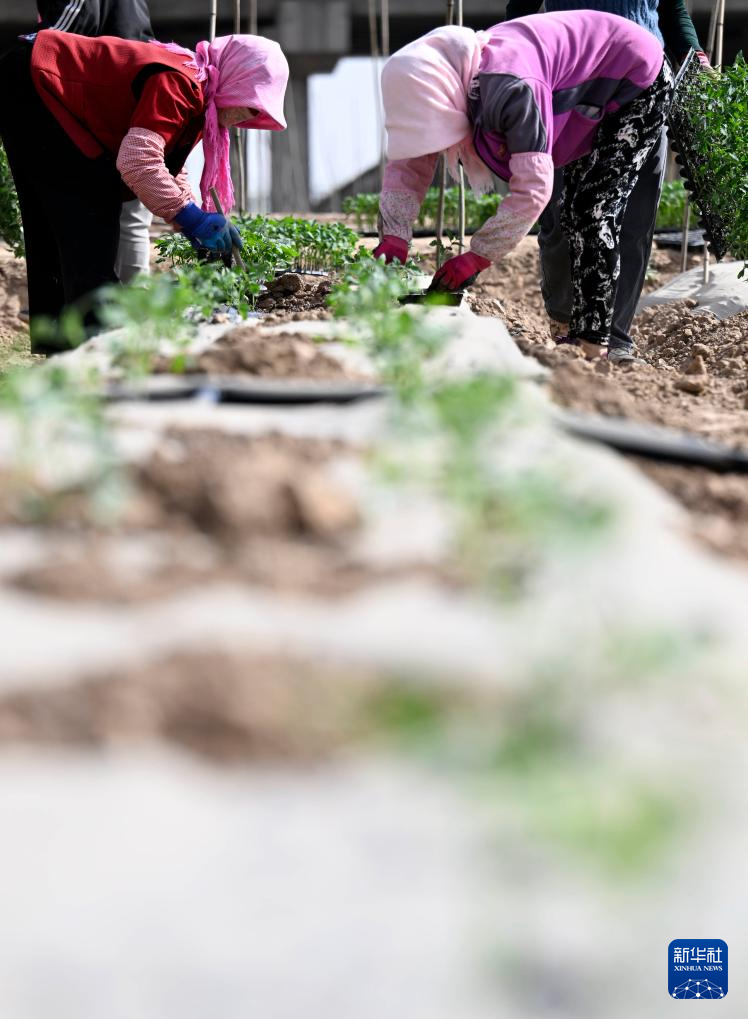 4月16日,在宁夏银川市贺兰县常信乡,农户在田间种植小番茄。