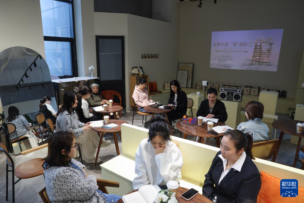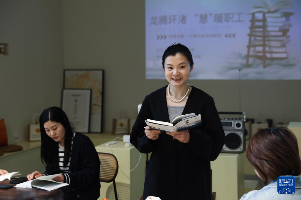 4月17日,在环渚街道的写字楼内,员工在开展“玫瑰书香”一寸读书会主题读书活动。