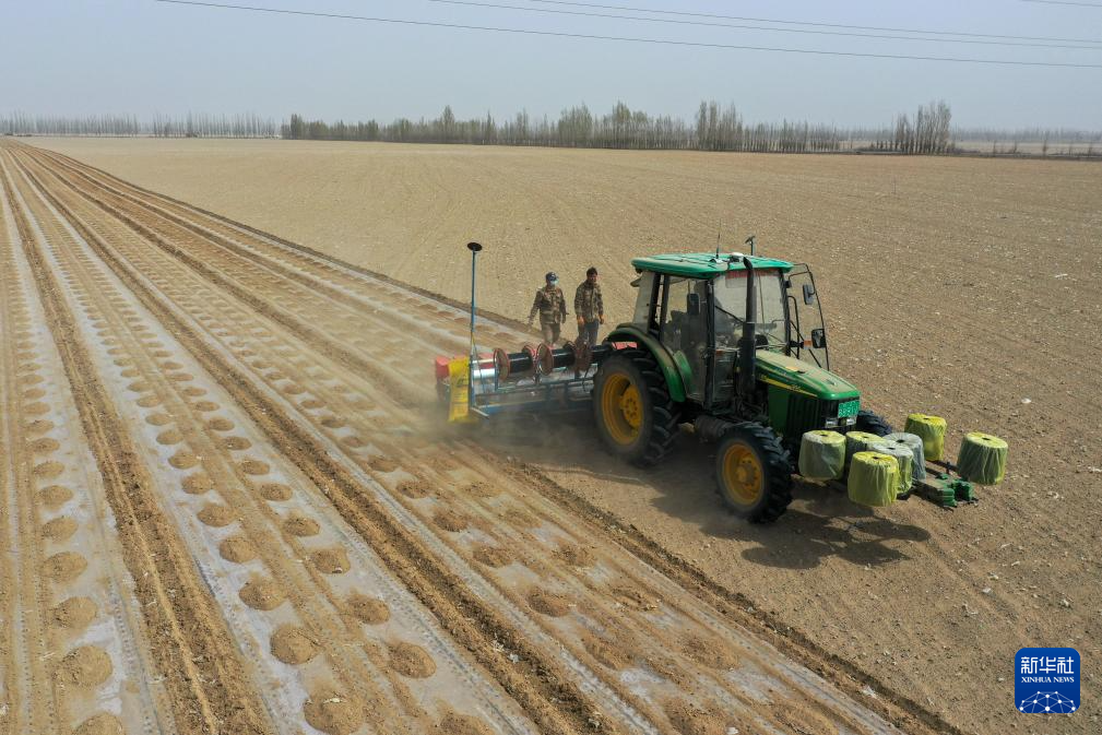 在新疆生产建设兵团第五师双河市九〇团,播种机在棉田春播(4月14日摄,无人机照片)。