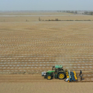 在新疆阿克苏地区阿瓦提县高标准农田核心示范区,播种机在棉田春播(3月27日摄)。