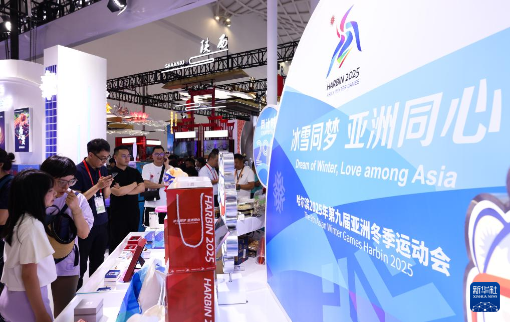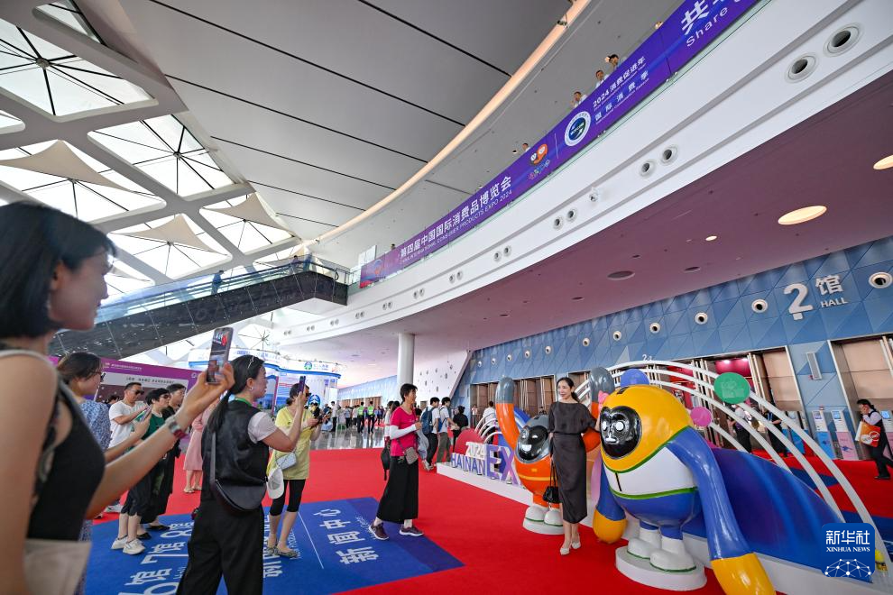 4月17日,观众在第四届消博会展馆中与吉祥物合影。
