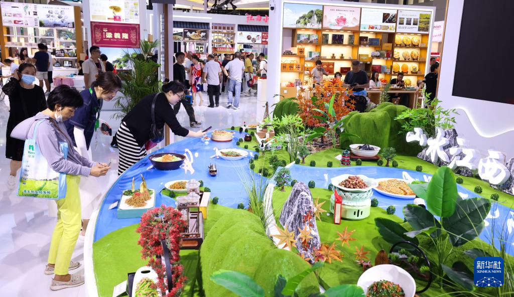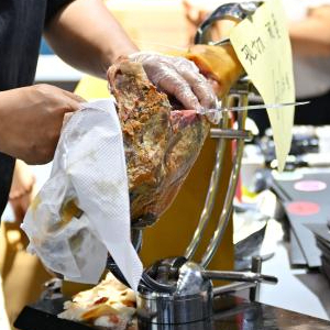 4月17日,观众在第四届消博会上选购西班牙火腿。