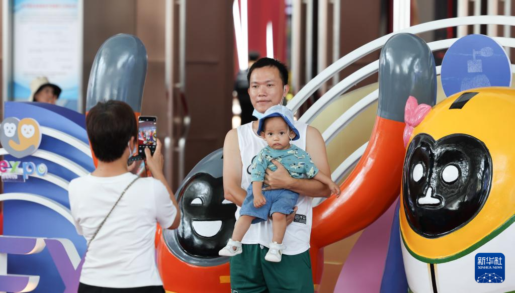 4月17日,小朋友在第四届消博会主会场与吉祥物合影。
