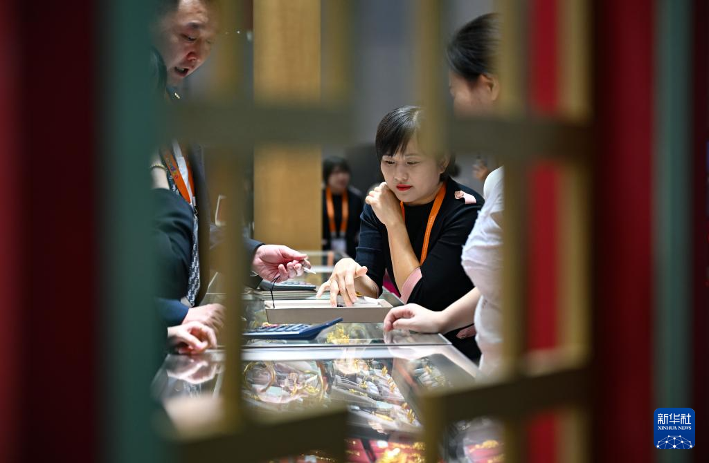 4月17日,展商在第四届消博会上为观众试戴首饰。