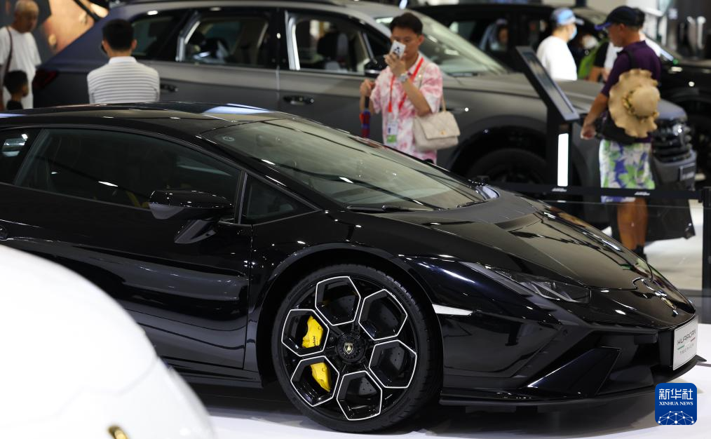4月17日,观众在第四届消博会上拍摄兰博基尼汽车。