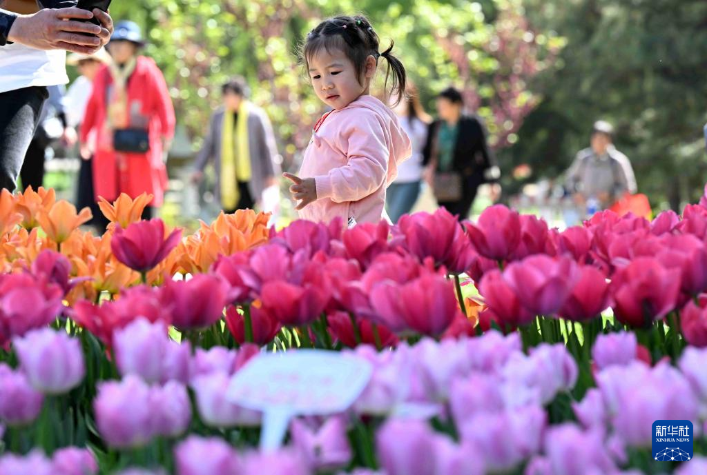 4月16日,小朋友在河北石家庄植物园游玩。
