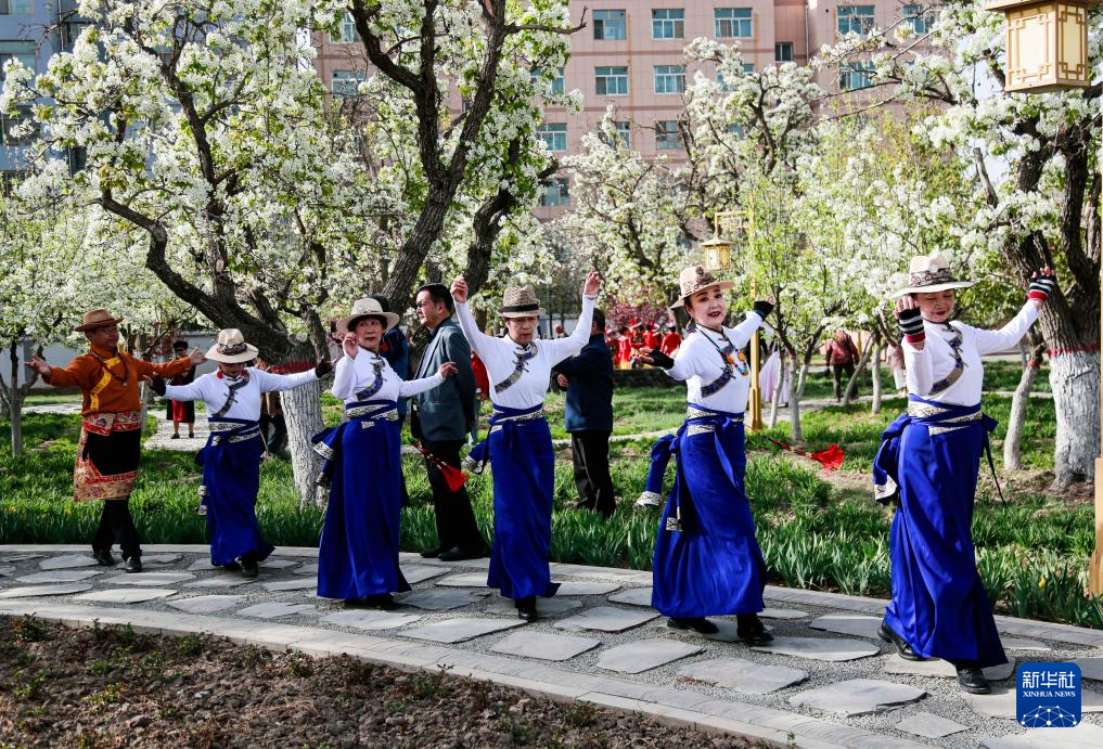 4月17日,市民在甘肃省张掖市甘州区胡家园子跳锅庄舞。