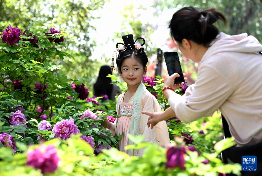 4月17日,人们在江苏省泰州市海陵现代农业产业园区牡丹园内赏花拍照。