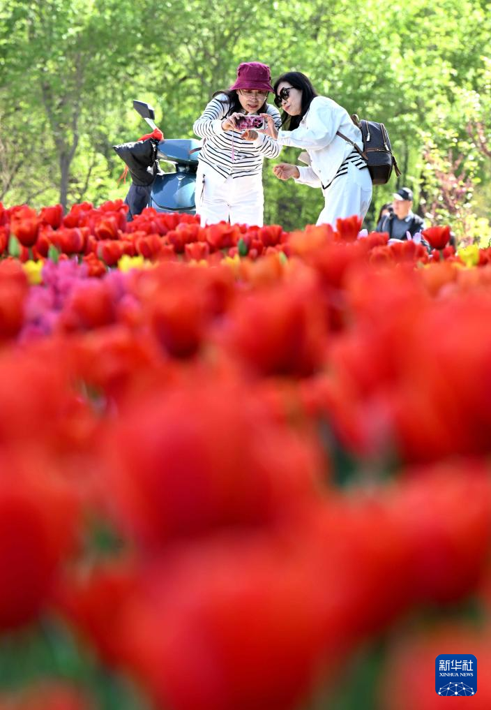 4月16日,游人在河北石家庄植物园赏花拍照。