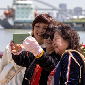 4月18日,人们在徐汇滨江主会场滨江沿线花卉景观前拍照留影。