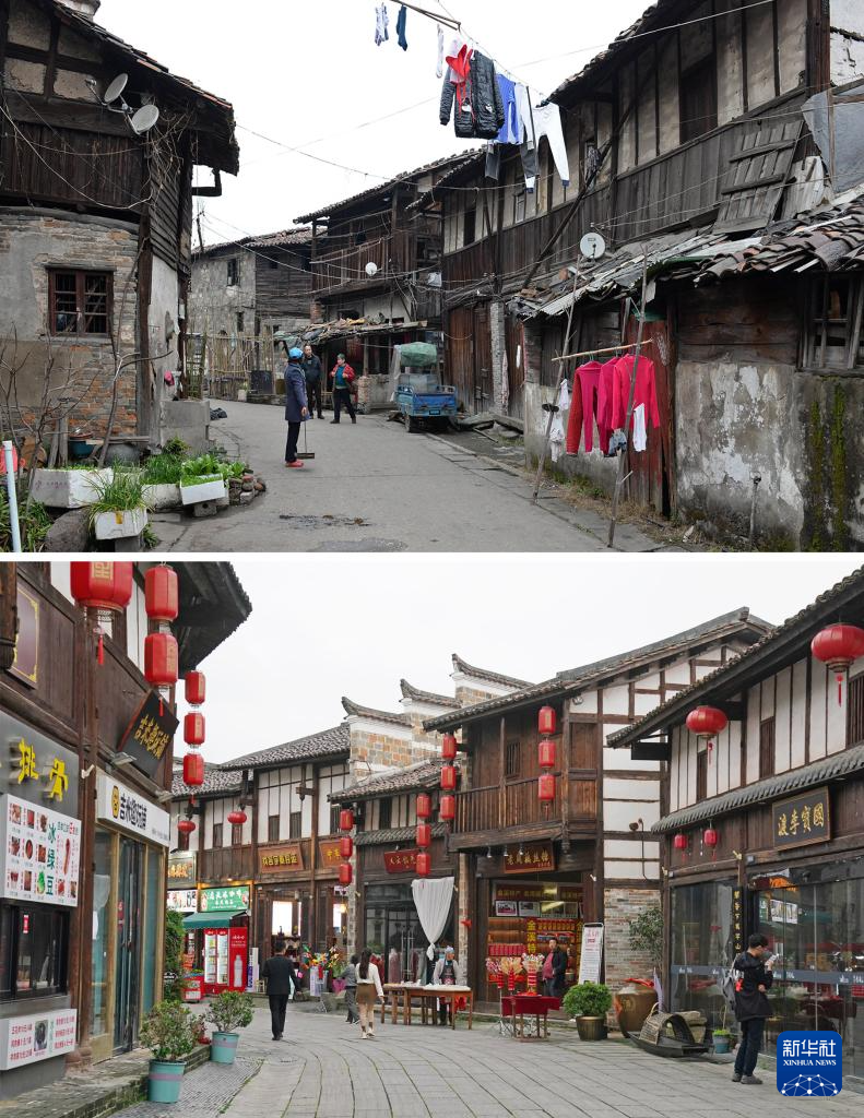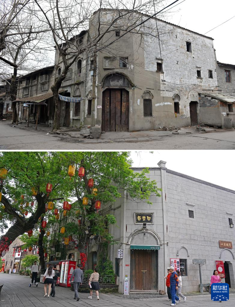 拼版照片:上图为文昌里历史文化街区三角巷修缮前的样貌(资料照片);下图为同一地点修缮后的街景(4月9日新华社记者万象摄)。
