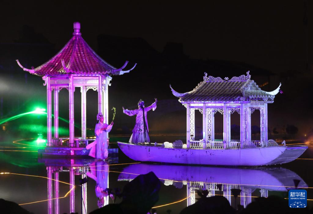在抚州市文昌里历史文化街区,演员在大型实景演出“寻梦牡丹亭”上表演(4月11日摄)。