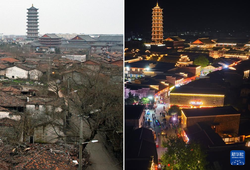 拼版照片:左图为文昌里历史文化街区修缮前的样貌(资料照片);右图为同一地点修缮后的夜景(4月9日新华社记者万象摄)。