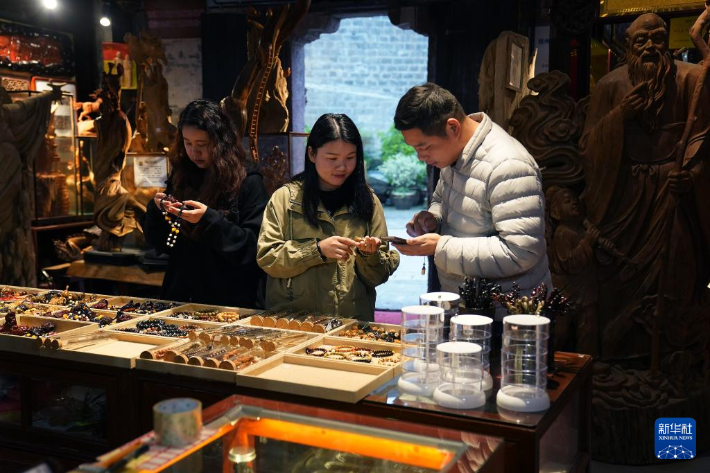 在抚州市文昌里历史文化街区,非遗传人许彬凯(右一)向游客介绍当地非遗木雕制品(4月9日摄)。