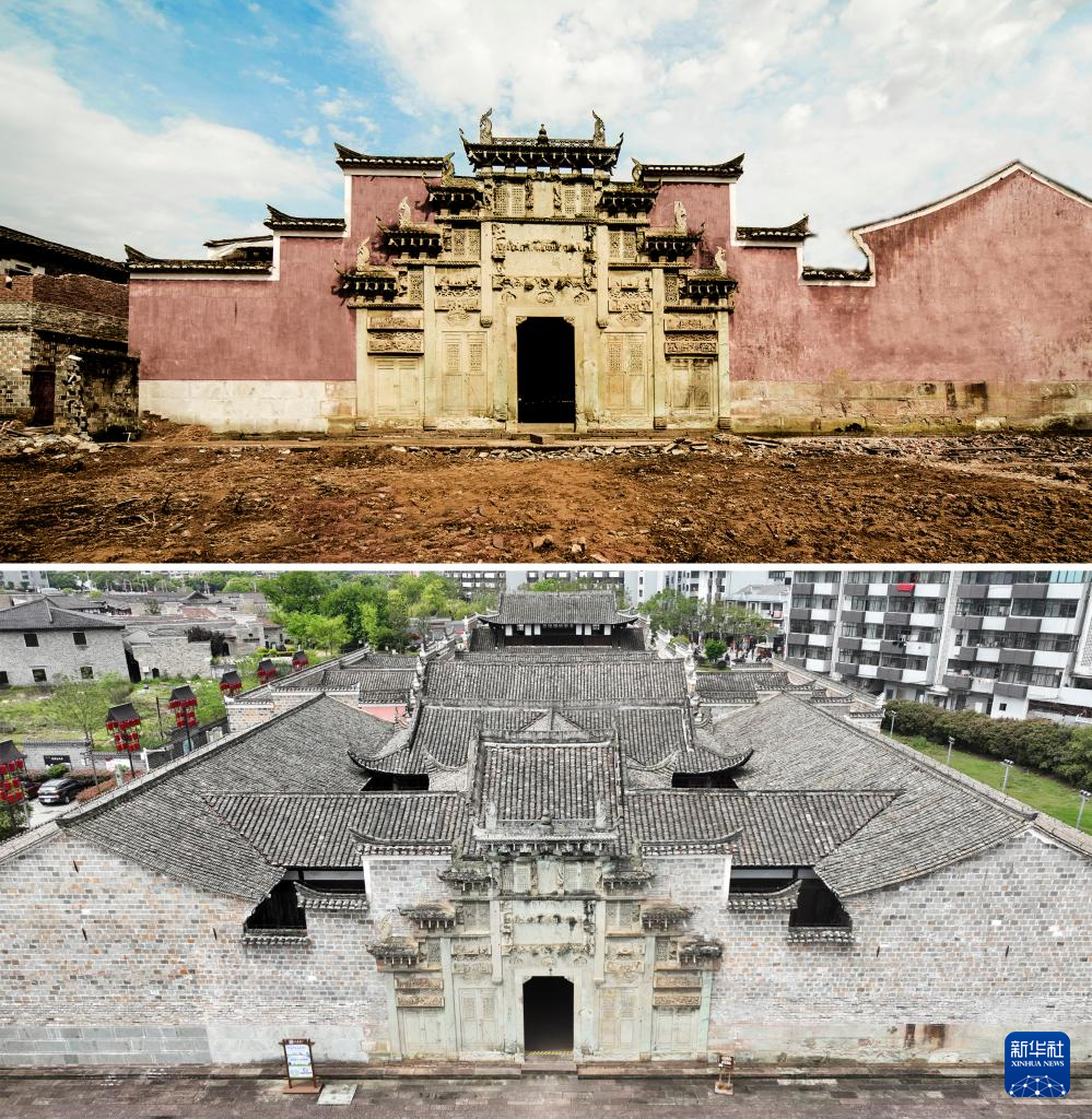 拼版照片:上图为文昌里历史文化街区玉隆万寿宫修缮前的样貌(资料照片);下图为修缮后的玉隆万寿宫(无人机照片,4月10日新华社记者万象摄)。