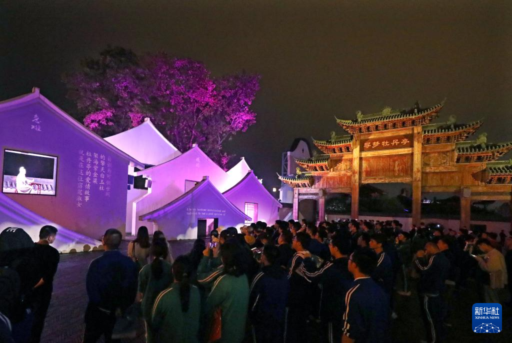 在抚州市文昌里历史文化街区,游客观看实景演出“寻梦牡丹亭”(4月11日摄)。