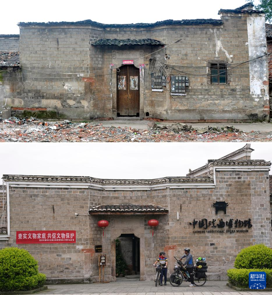 拼版照片:上图为文昌里历史文化街区炉子厂路6号修缮前的样貌(资料照片);下图为炉子厂路6号修缮后成为中国戏曲博物馆(4月10日新华社记者万象摄)。