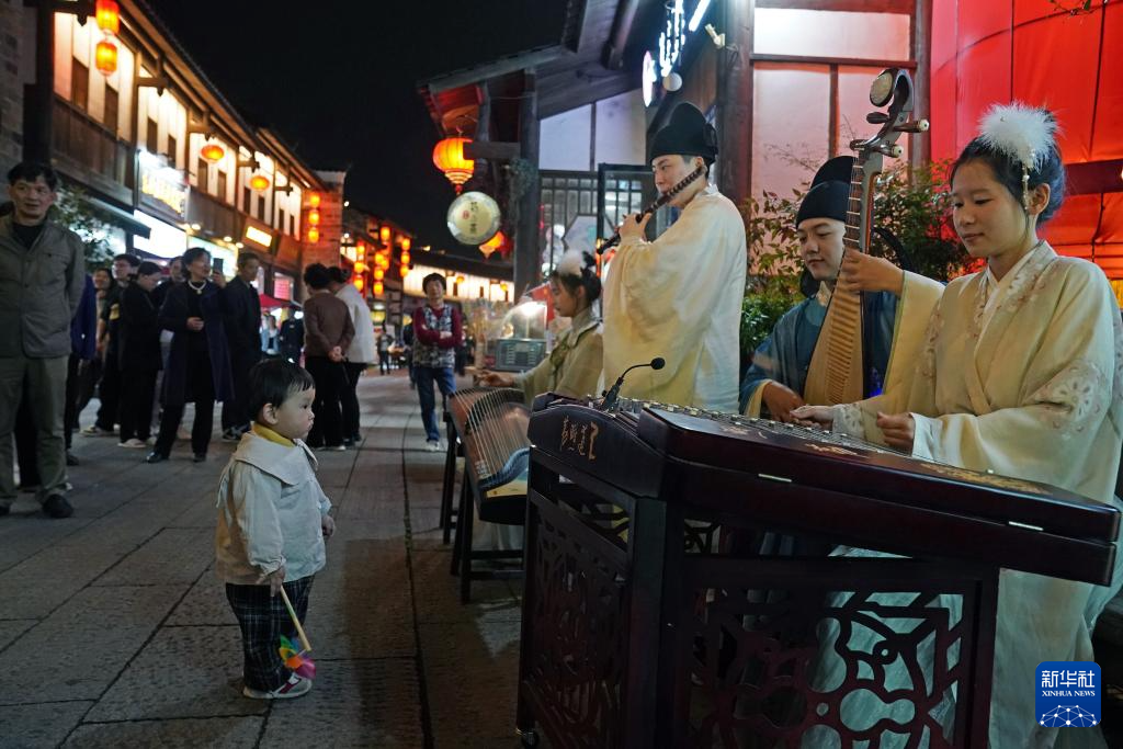 在抚州市文昌里历史文化街区,演艺人员演奏传统民乐(4月9日摄)。