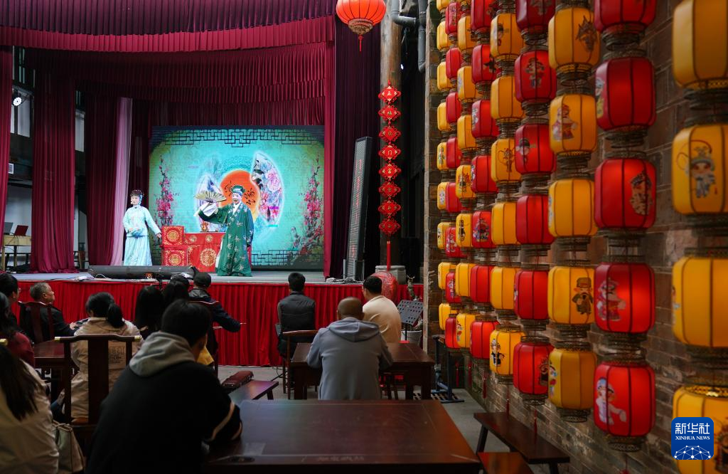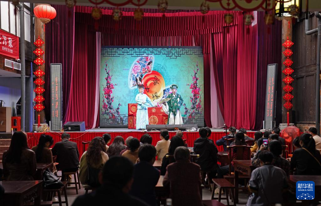 在抚州市文昌里历史文化街区旭东戏社,演员为观众表演采茶戏《贩马记》选段(4月10日摄)。