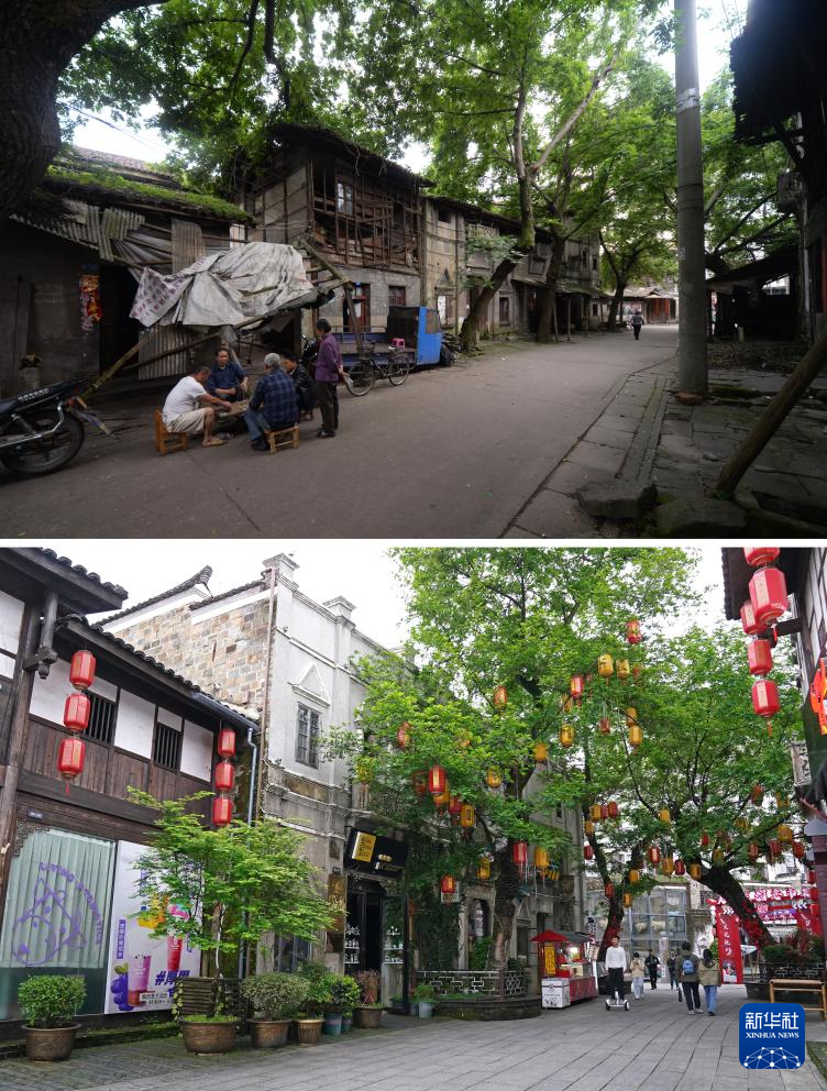 拼版照片:上图为文昌里历史文化街区横街修缮前的样貌(资料照片);下图为同一地点修缮后的街景(4月9日新华社记者万象摄)。