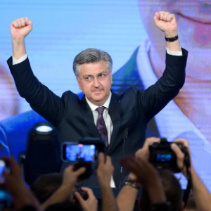 4月17日,在克罗地亚萨格勒布,克罗地亚总理普连科维奇庆祝民共体赢得议会选举。