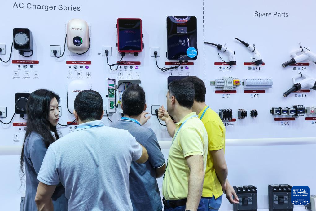 4月15日,参展商在第135届广交会上向采购商介绍新能源汽车充电设备。