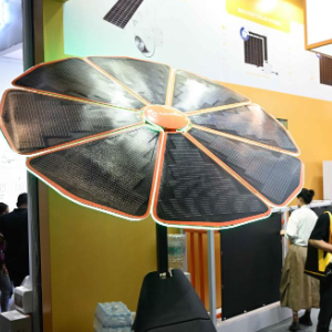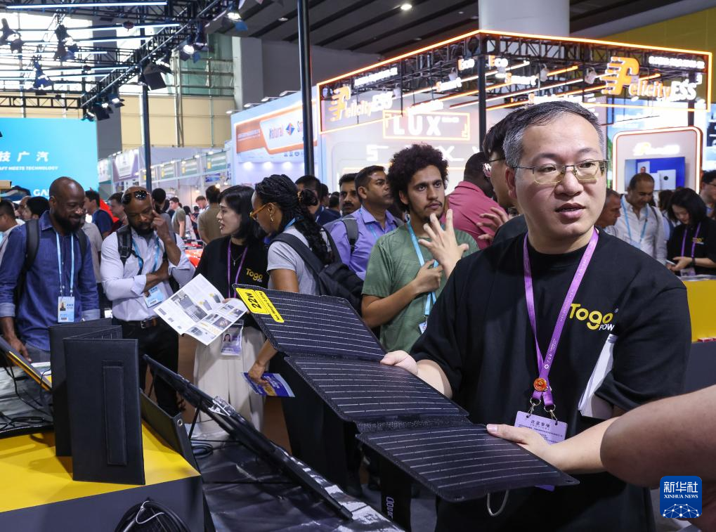 4月15日,参展商在第135届广交会上向采购商展示便携式折叠太阳能电池组件展品。
