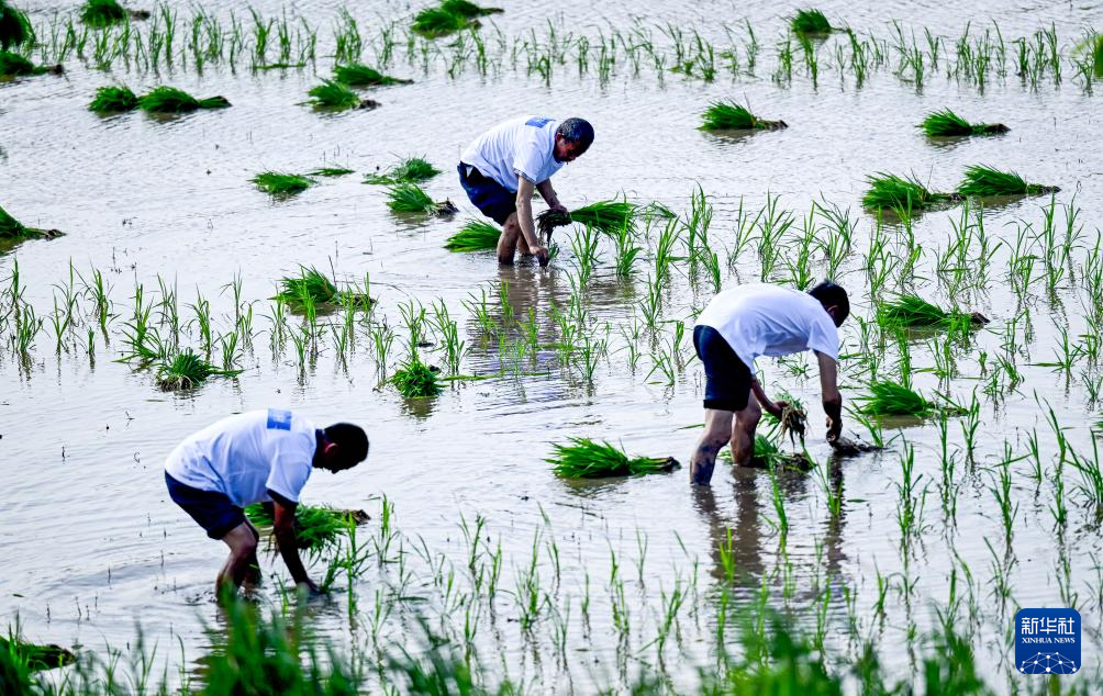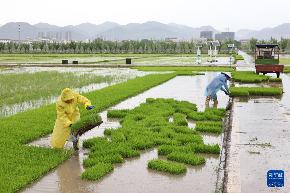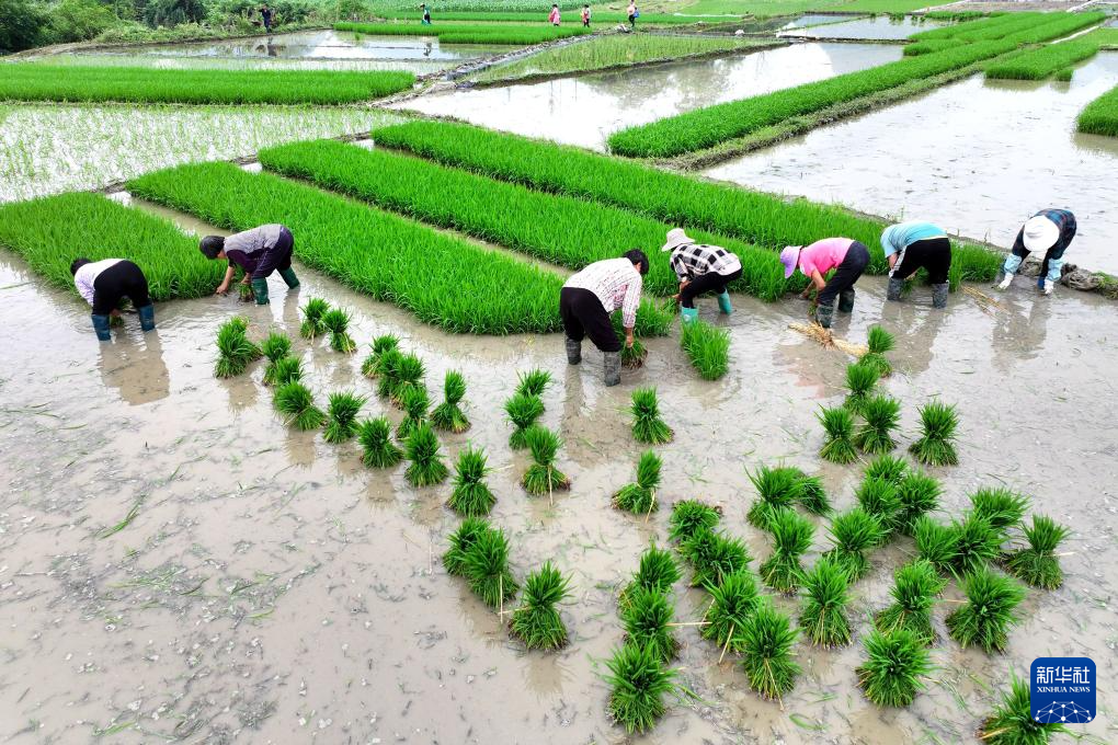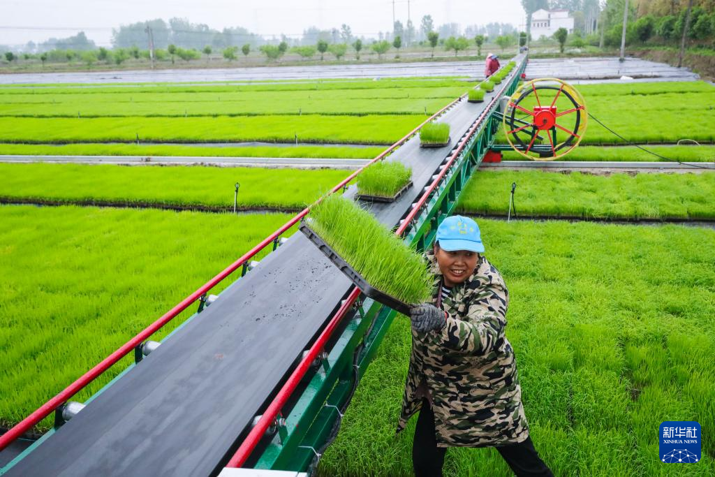 4月19日,在四川省内江市东兴区田家镇粮油现代农业园区,村民在育秧基地内移栽秧苗。