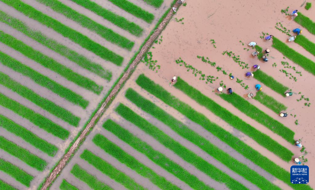 4月19日,在湖南省衡阳市祁东县金桥镇,当地村民在起秧苗(无人机照片)。