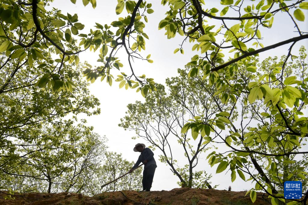 4月19日,在山东省淄博市沂源县悦庄镇张家庄村,农民在栗子园里整理土地。