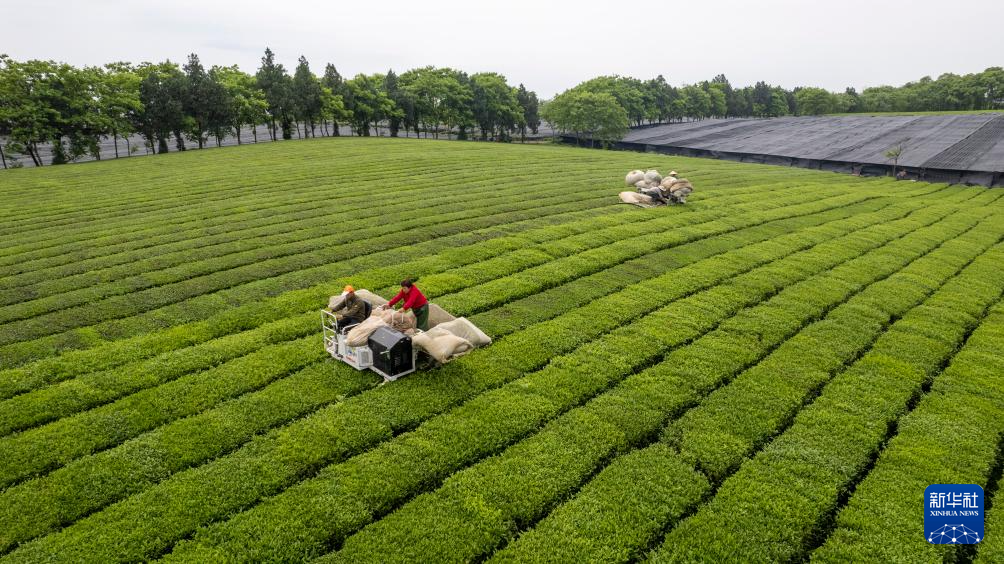 4月19日,在浙江省兰溪市上华街道一处茶园内,采茶工驾驶采茶机械采收茶叶(无人机照片)。