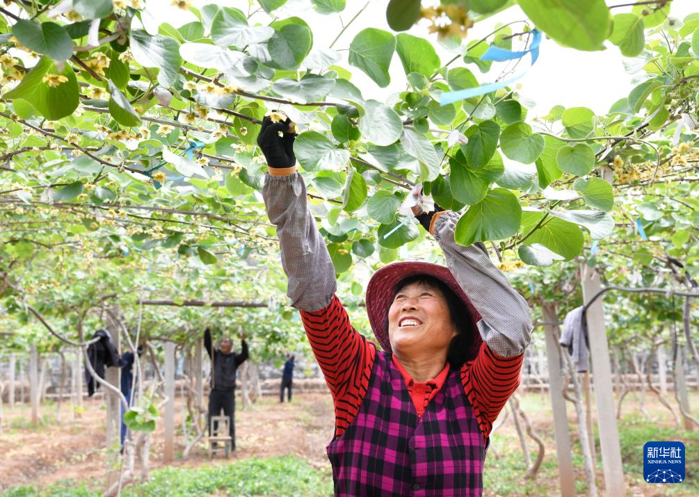 4月19日,山东枣庄山亭区城头镇马山家庭农场的农民在猕猴桃园疏花。