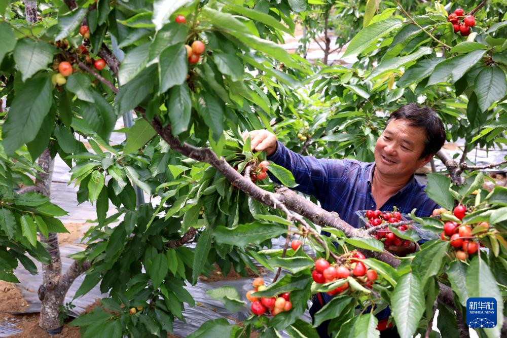 4月19日,山东省枣庄市齐村镇前良村农民在果园里采摘樱桃。