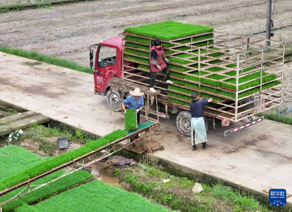 4月19日,浙江省武义县王宅镇仁村育秧工厂员工在给种粮大户起运秧苗(无人机照片)。