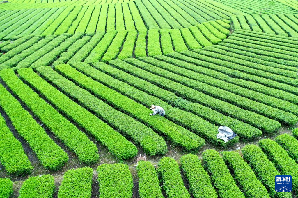 4月19日,茶农在湖北省宣恩县椒园镇的茶园里采摘“谷雨茶”(无人机照片)。