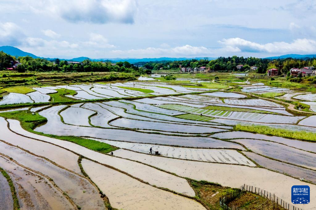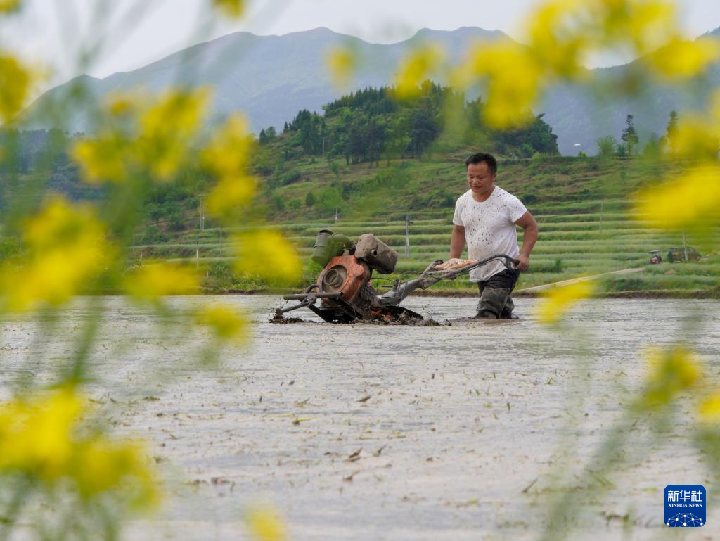 4月19日,重庆市南川区兴隆镇金花村村民在耕地整田。