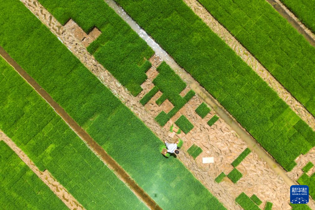 4月19日,在湖南省永州市道县白马渡镇东山村集中育秧基地,农民在起秧苗(无人机照片)。
