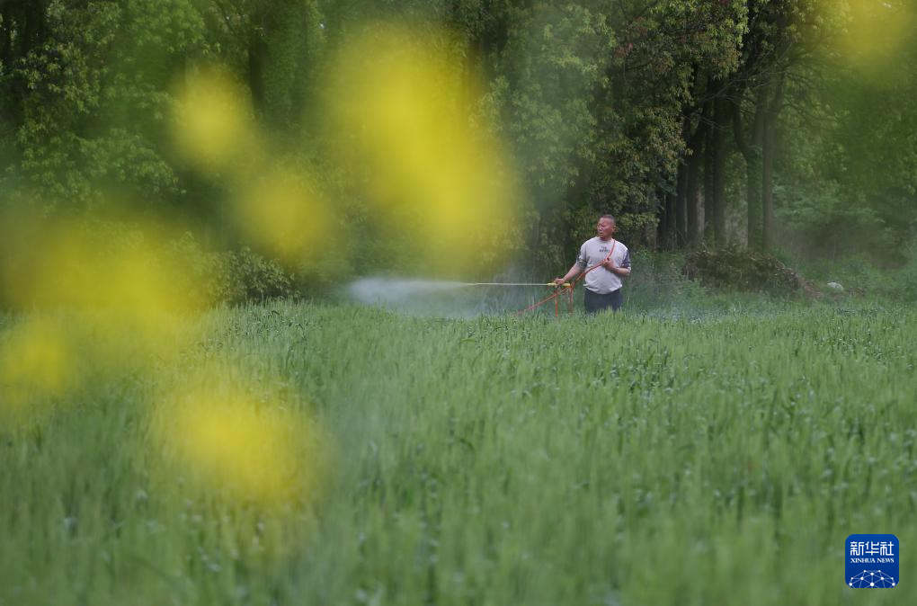 4月19日,江苏省镇江句容市白兔镇上荣村农民在麦田喷洒农药。