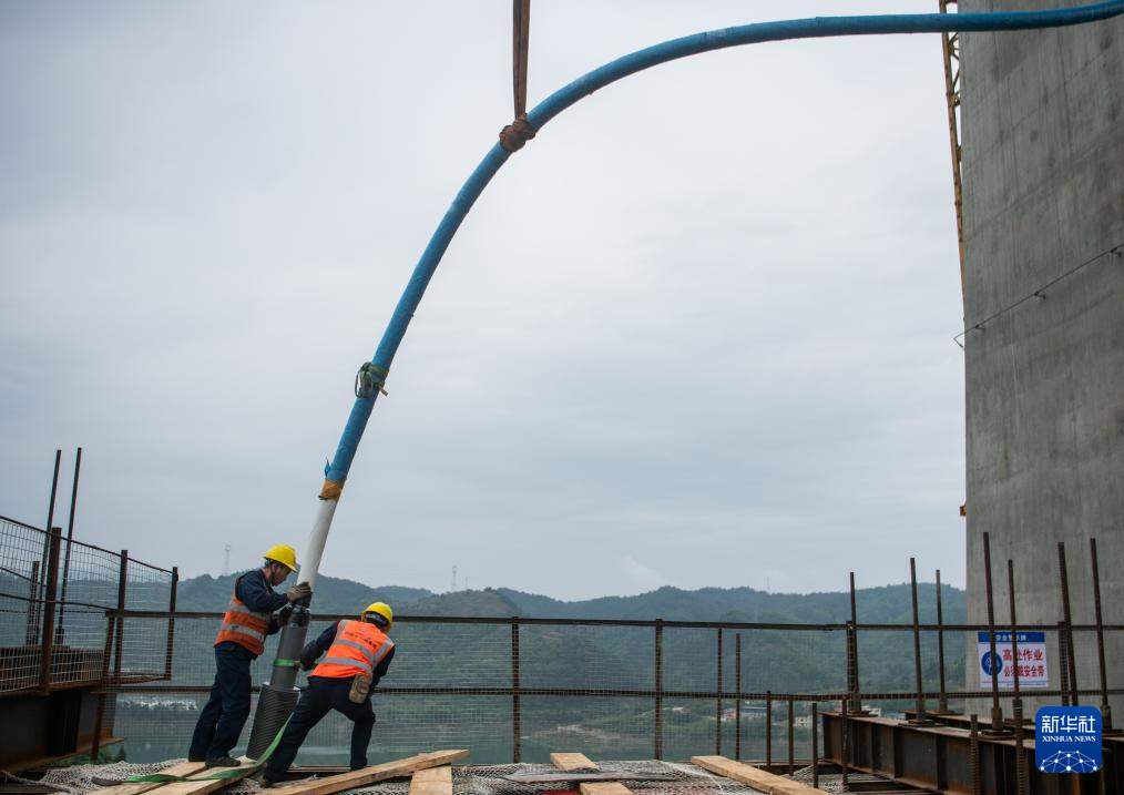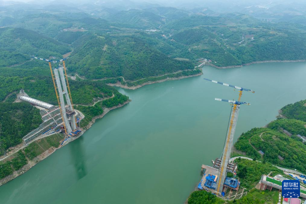 4月19日拍摄的汉江特大桥两岸主塔施工现场(无人机照片)。