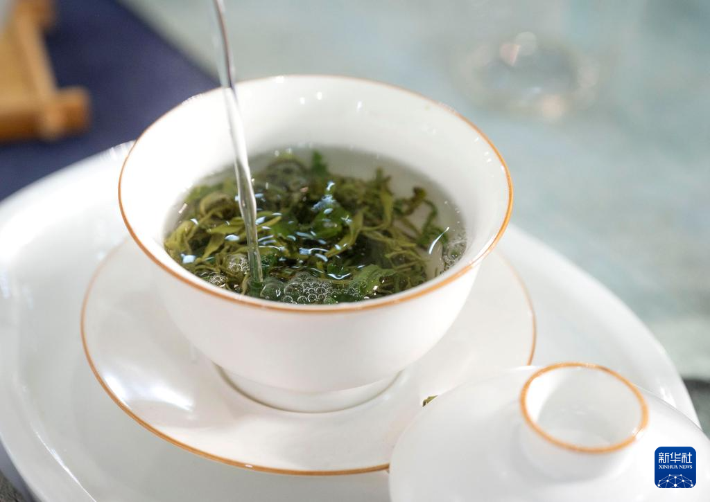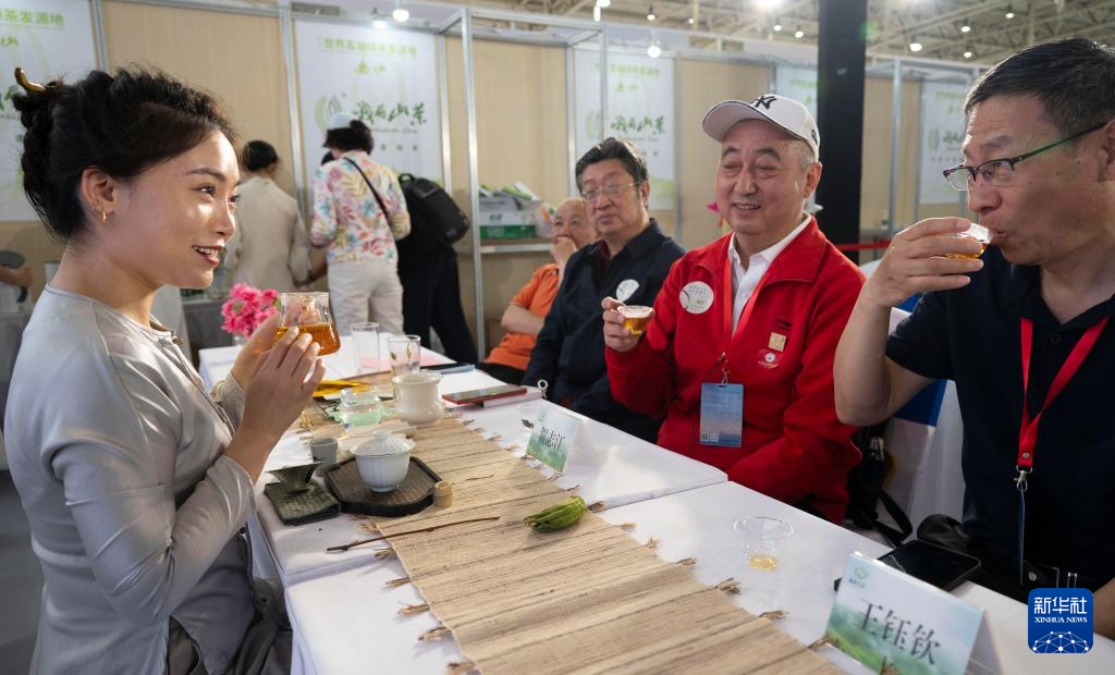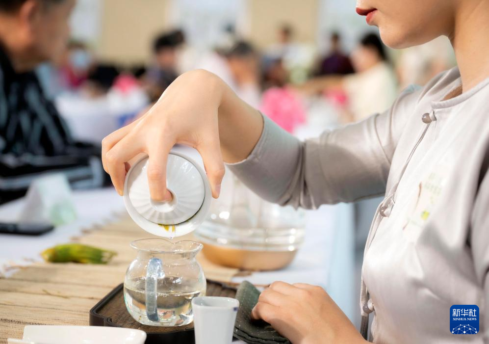 4月19日,在北京茶博会上,观众品尝西湖龙井茶。