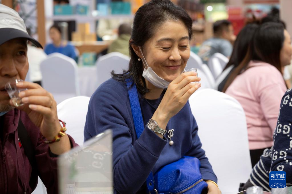 4月19日,在北京茶博会上,一名观众品尝西湖龙井茶。