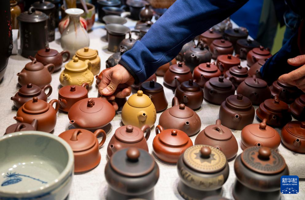4月19日,一名观众在北京茶博会上挑选茶壶。