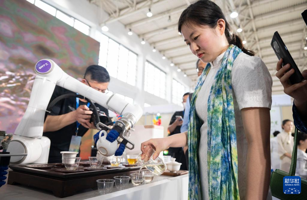 4月19日,在北京茶博会上,茶艺师(右)与一款泡茶机器人共同为观众倒茶。