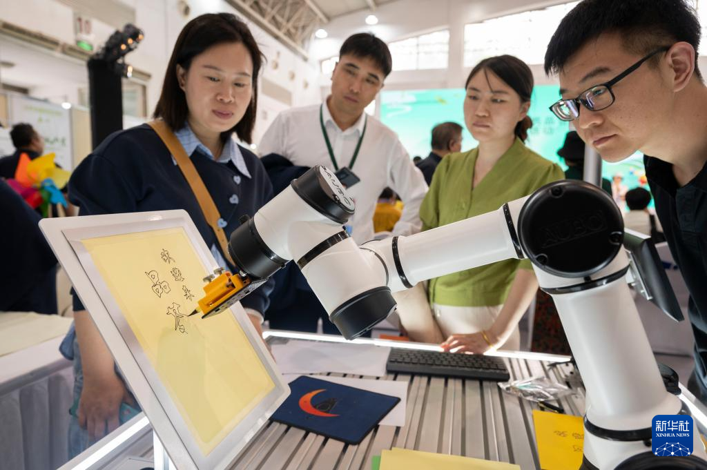 4月19日,在北京茶博会上,观众观看一款绘画机器人书写“欢迎来品茶”。