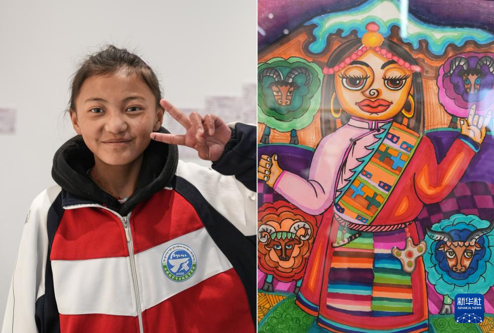 4月19日拍摄的拉萨市特殊教育学校13岁的听障学生白玛次仁和她的作品《放羊的小卓玛》(拼版照片)。