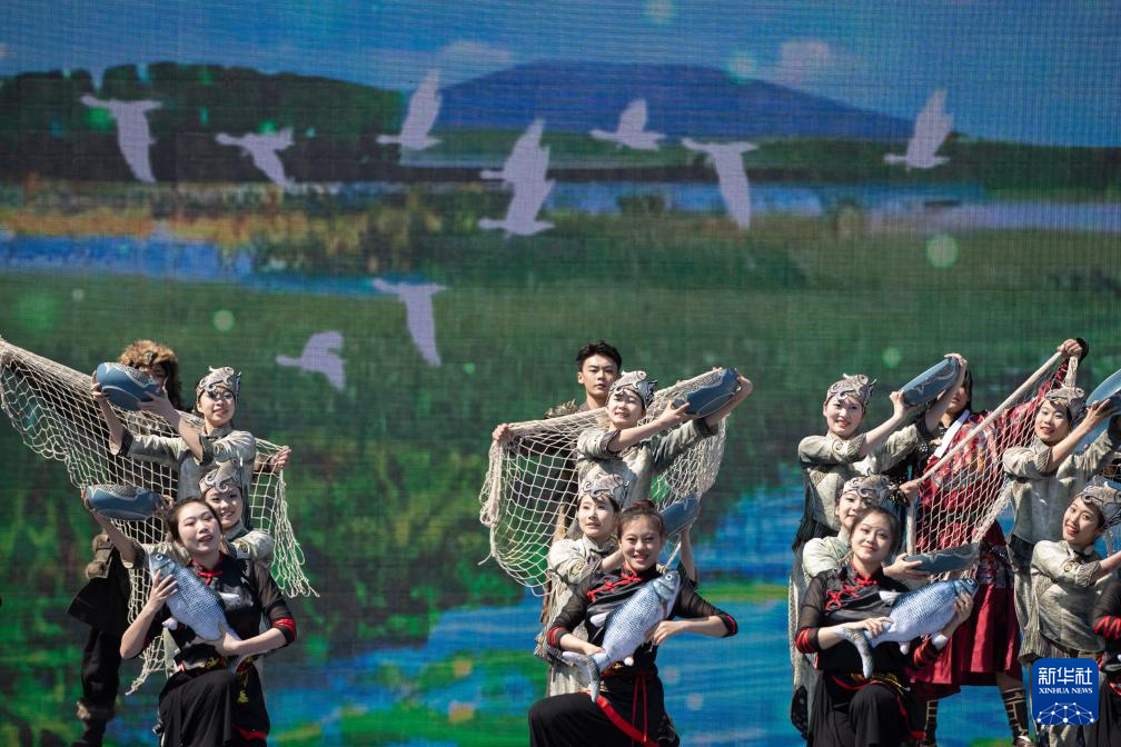 4月19日,演职人员在哈尔滨市开江民俗文化周开幕式现场表演。
