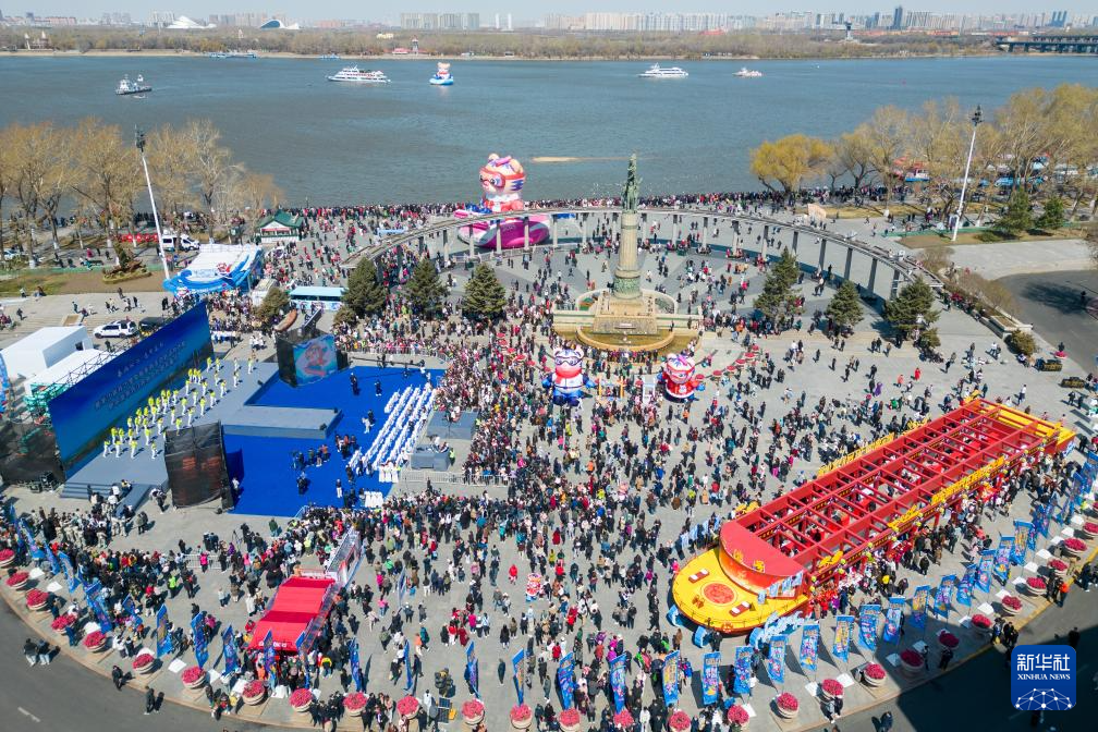 这是4月19日拍摄的哈尔滨市开江民俗文化周开幕式现场(无人机照片)。