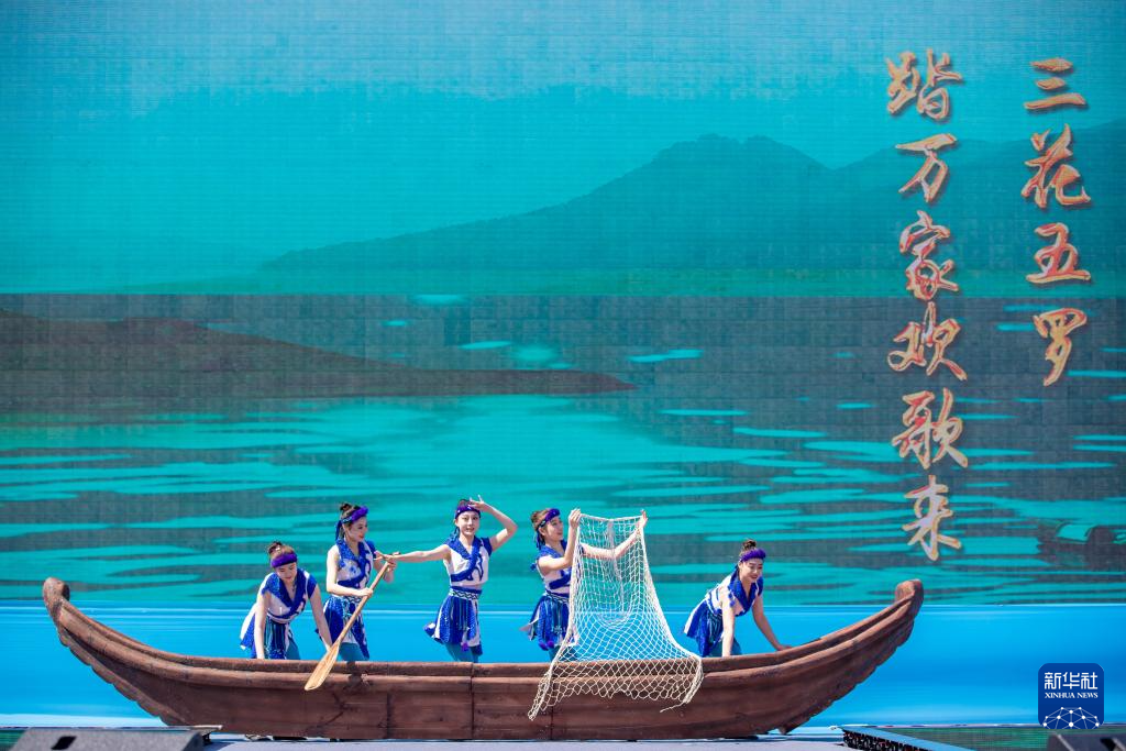 4月19日,在哈尔滨市开江民俗文化周开幕式现场,演职人员身着传统服饰表演。