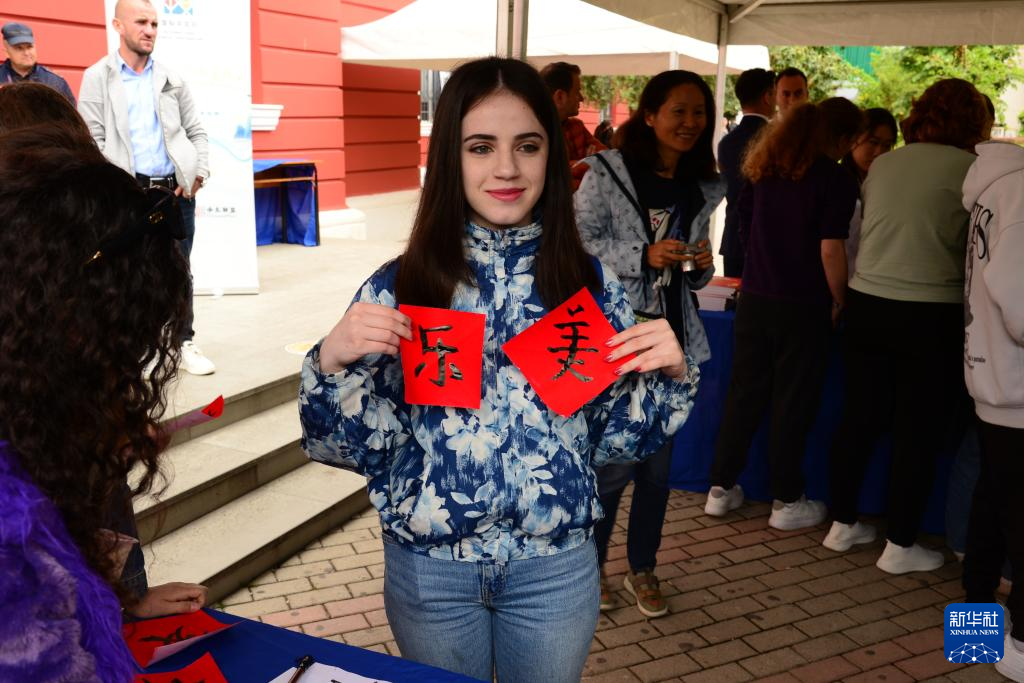 4月19日,在阿尔巴尼亚地拉那大学孔子学院举办的中文日庆祝活动上,当地学生展示自己写的汉字。
